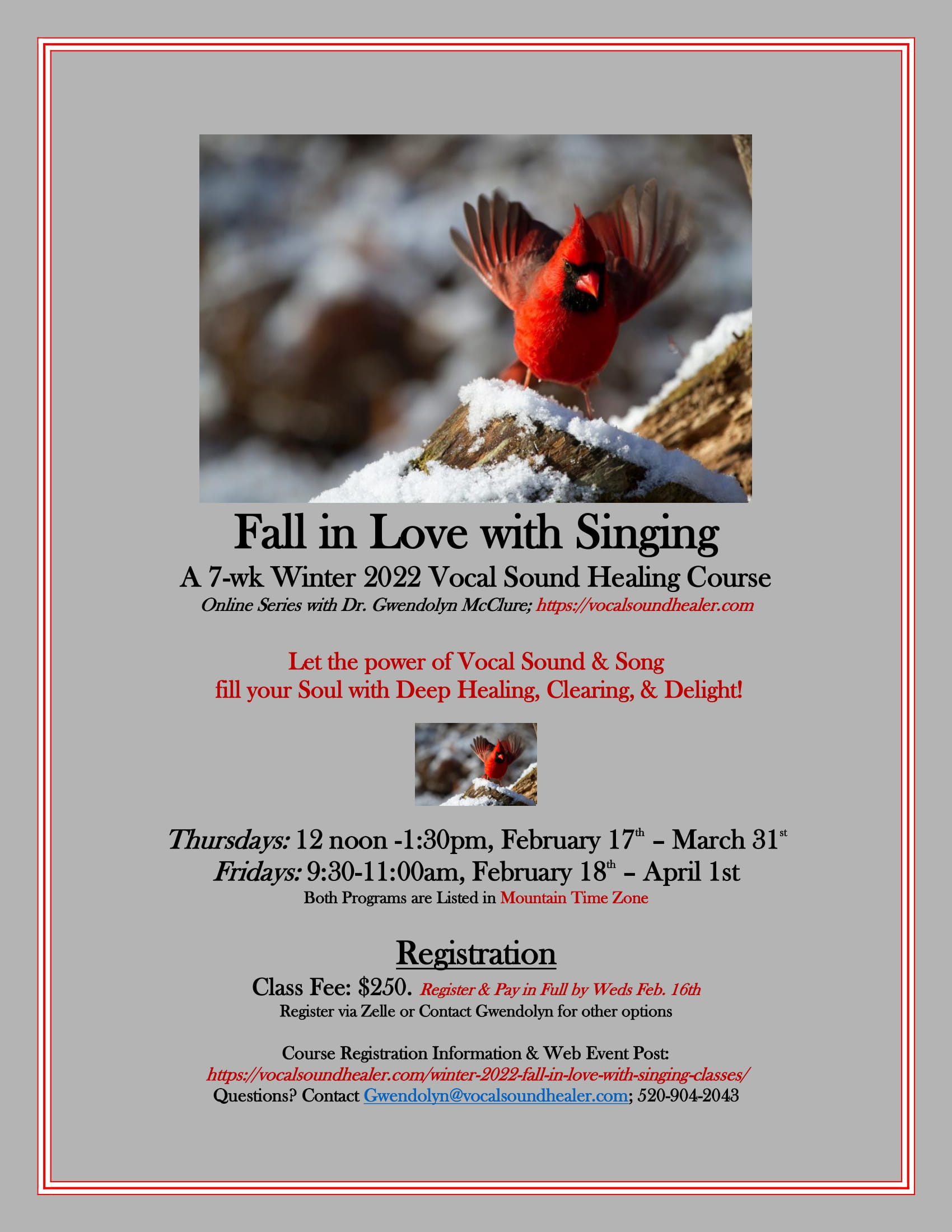 Registration Information below. Website Event blogpost here: https://vocalsoundhealer.com/winter-2022-fall-in-love-with-singing-classes/.